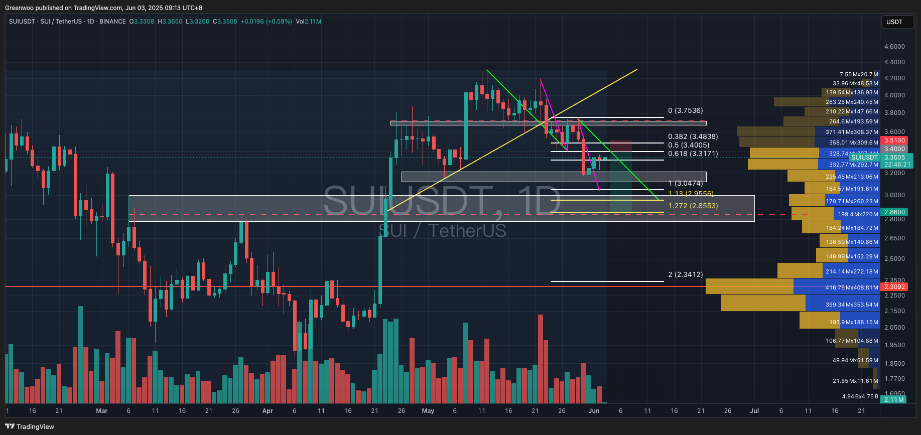 连续跌破黄色趋势线及前低(白色方框区域)后,在3美元附近获得支撑,撰稿时反弹至3.38美元。投资者可选择现价或3.4美元附近入场做空。该位置对应斐波那契0.5回撤位、前期阻力区及高成交量交易区。