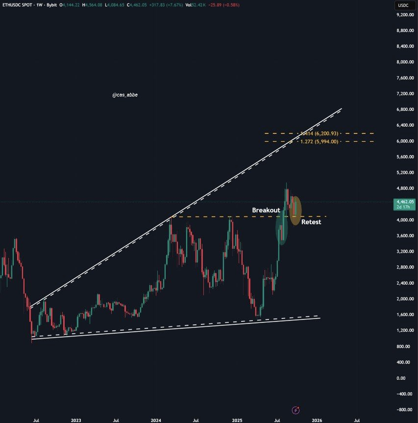 以太坊正以加速势头实现稳健复苏。分析师Cas Abbé强调,以太坊正在进行周线级别的强势回测,并伴随健康交易量。在冲击历史新高前,可能先回调至4100-4200美元区间,该价位或将成为后续上涨的支撑位。