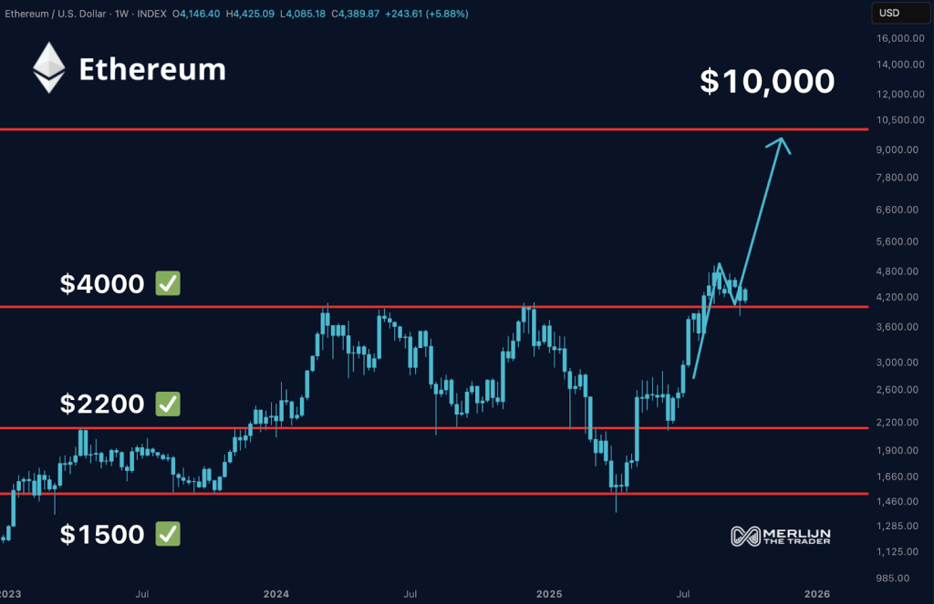 交易员Merlijn则提出更为激进的观点。他指出以太坊的看涨图表形态昭示着1万美元目标价,并回顾了突破1500美元、2200美元和4000美元等历史阻力位时的市场疑虑。当前以太坊已处于更强劲的上升通道中。