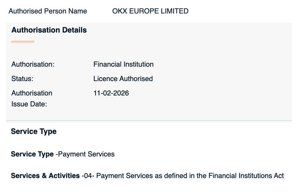马耳他金融服务局记录显示,OKX的支付机构许可证于2月11日签发,在公司网站上被列为金融机构许可证。该许可证允许交易所在全欧盟提供全方位支付服务,包括支持用户从支付账户存取现金,以及执行维护账户所需的所有操作。