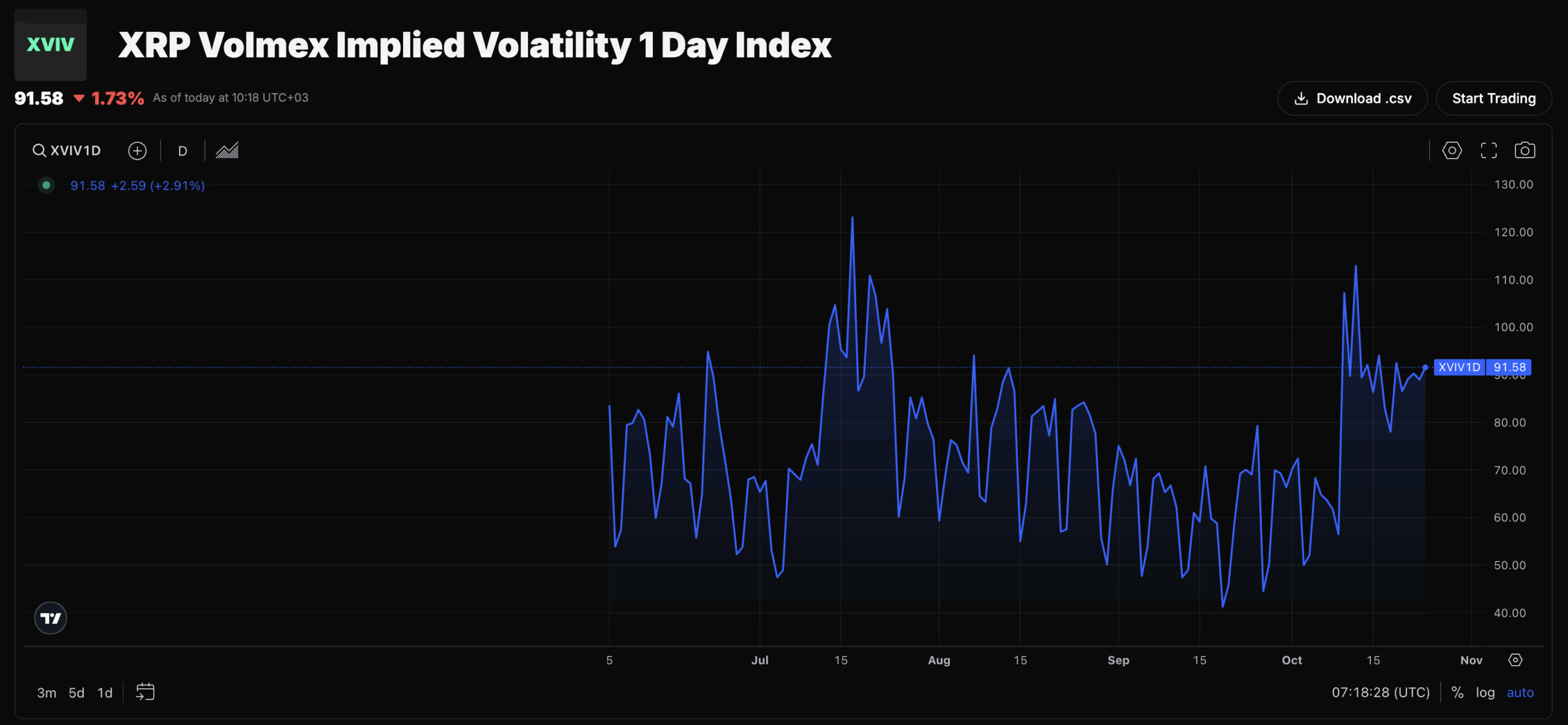 XRP单日隐含波动率达91%,Solana为76%。这意味着XRP可能在24小时内波动约4.7%,Solana约4%。