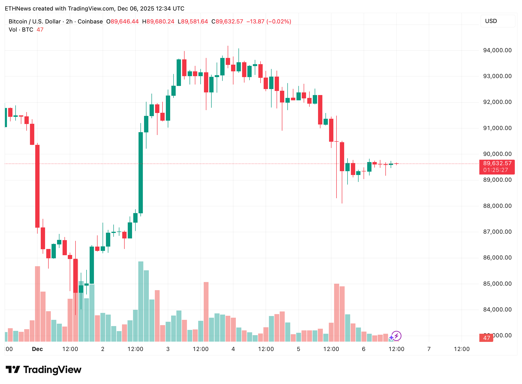图表清晰展示了12月第一周的价格轨迹:在月初急跌后出现强势反弹,推动比特币触及90,000美元中段区域,但未能守住涨幅。随后走势逐渐转为下行,形成连续降低的高点与低点。