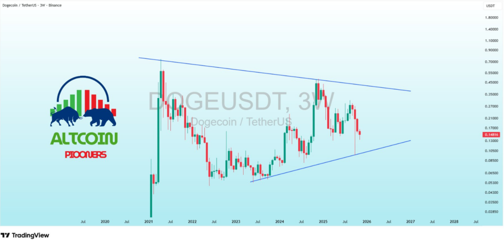 从三周图表观察,DOGE长期技术结构保持稳固。自2021年见顶以来,价格始终在大型三角形态内震荡。上方趋势线成功遏制了每次上涨攻势,而逐步抬升的底部趋势线则为所有重要回调提供支撑。当前DOGE再度触及这条支撑线。