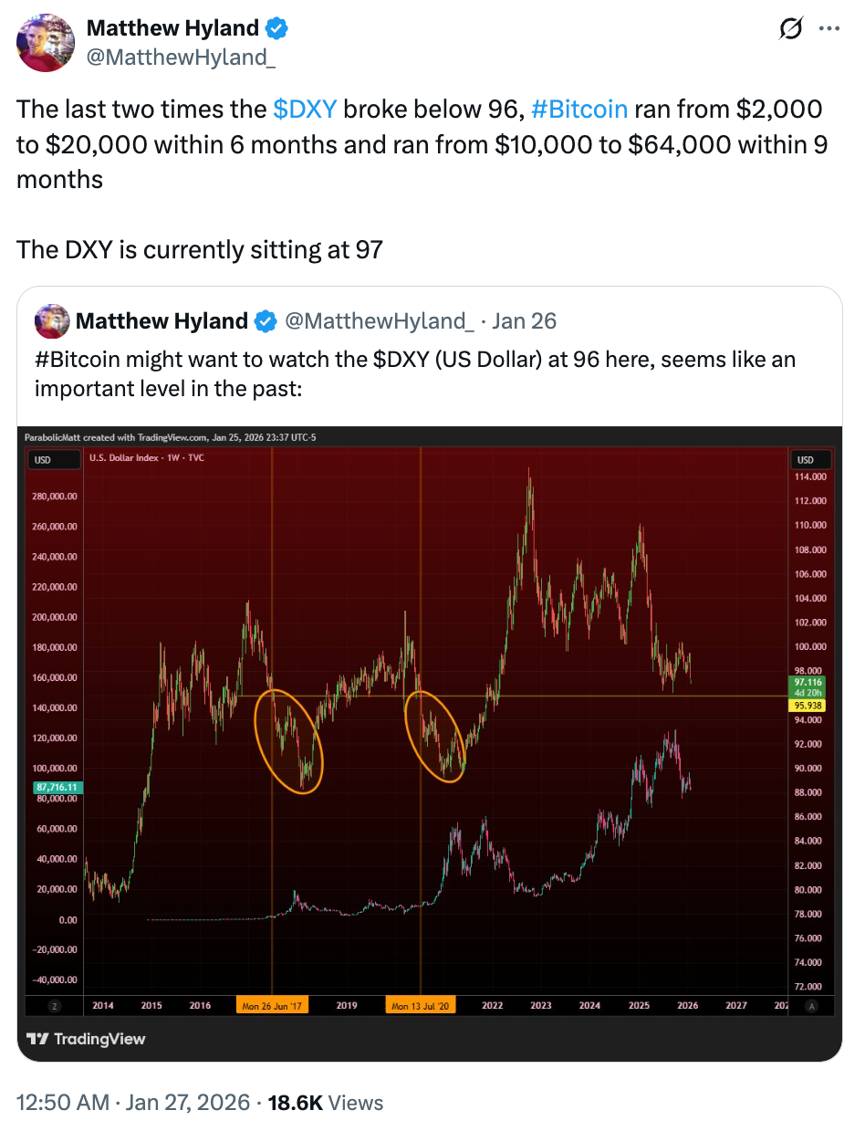 另一位分析师Matthew Hyland则基于美元强势指数的表现,预见到比特币价格可能出现的突破。他预期,一旦美元指数跌破96关口,比特币兑美元汇率将开启反弹,这在2017年和2022年曾出现过。