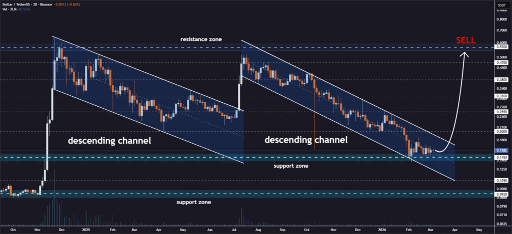 在三日图表上,恒星币(XLM)显示出具有潜力的技术形态。加密货币分析师乔纳森·卡特报告指出,XLM正在一个下降通道内的关键支撑区域上方进行盘整。