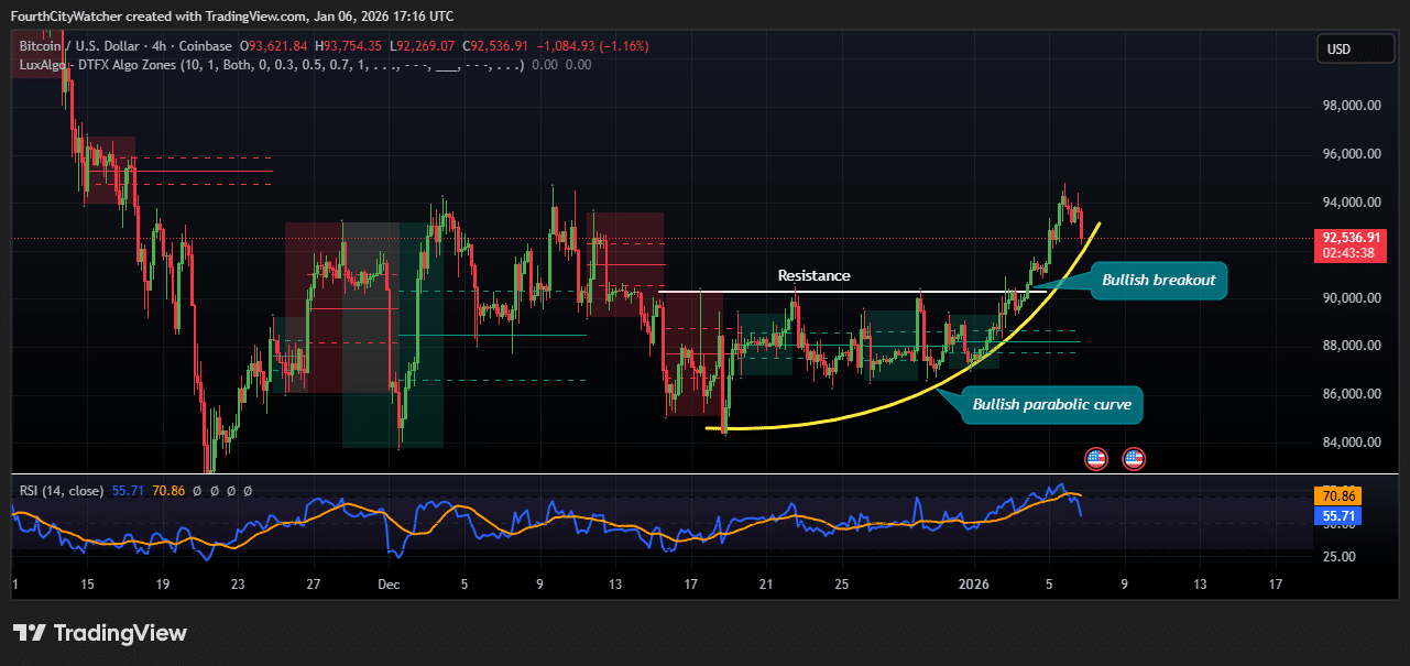 比特币(BTC/USD)四小时图表显示明确的看涨结构。价格近期突破90,000美元附近的关键水平阻力位,标志着强劲的看涨突破。此次突破始于85,000美元附近形成的抛物线曲线,表明上行动能正在增强。