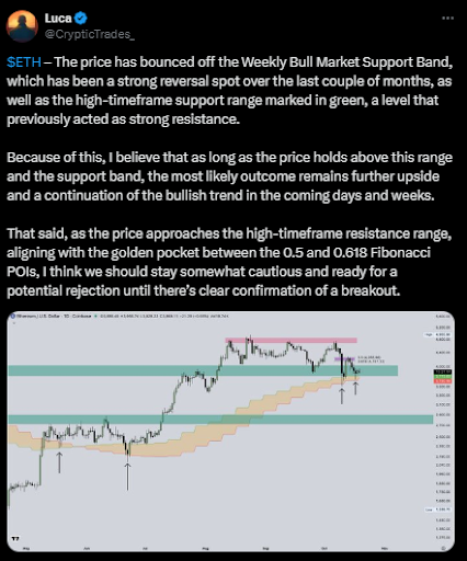 分析师将下一目标位锚定在4500美元(震荡区间上沿),有效突破该位置将确认大级别趋势延续。上方4800美元附近存在早期派发区形成的额外阻力,该区域与夏末的供应带重合。若能强势突破这些阻力带,后续或将打开5200美元的量度空间(该目标源自前轮旗杆高度)。若动能持续,5800美元附近也可能成为潜在目标——但需满足全生态普涨条件。