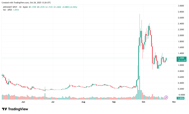 当前报价1.24美元的ApeX Protocol(APEX)市值达1.6亿美元,虽较历史高点回调45%,但近期动作显示复苏迹象。该项目专注于资产代币化,并与Tokeny和AMINA银行建立合作,搭建传统金融与去中心化体系的桥梁。其推出的代币回购计划和基于Cardano的跨链质押功能,可能在DeFi领域扩张期引发价格跃升。
