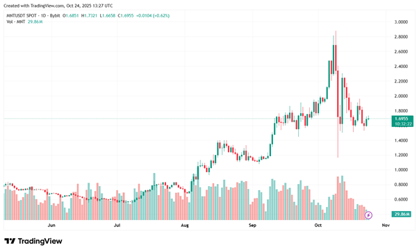 市值55亿美元的Mantle(MNT)现报1.68美元,采用零知识证明Rollup技术解决扩容难题。虽然较峰值有所回落,但交易量激增450%。分析师指出若能突破当前盘整区间,短期或有33%上涨空间,技术创新和生态扩展将推动长期价值增长。