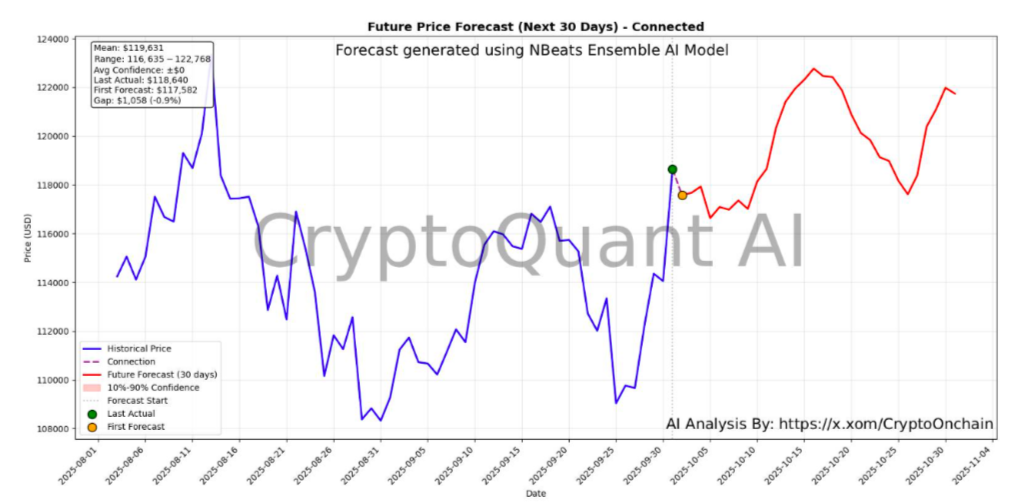 尽管交易员保持看涨,AI分析显示十月行情可能更为平淡。CryptoQuant的NBeats Ensemble模型分析近400项链上特征后指出,比特币大概率维持当前区间,并略微偏向区间上半部分。