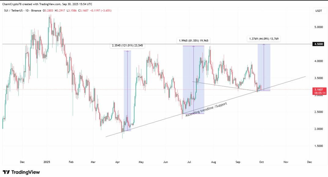 与此同时,SUI正酝酿冲击4.5美元关口。该代币从上升支撑趋势线反弹后重获市场关注,2025年内该支撑线已多次引发上涨行情。当前SUI报价约3.16美元,即将测试历史阻力位4.5美元。