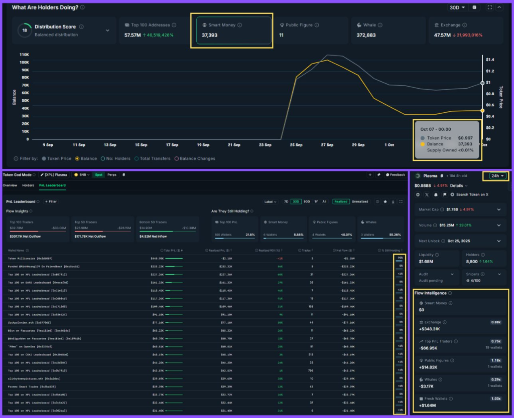 10月1日,Cryptor发现异常现象:尽管XPL图表走势健康,但85%的顶级盈利交易者已平仓XPL头寸。这意味着所谓的"聪明资金"已撤离,这通常是危险信号。