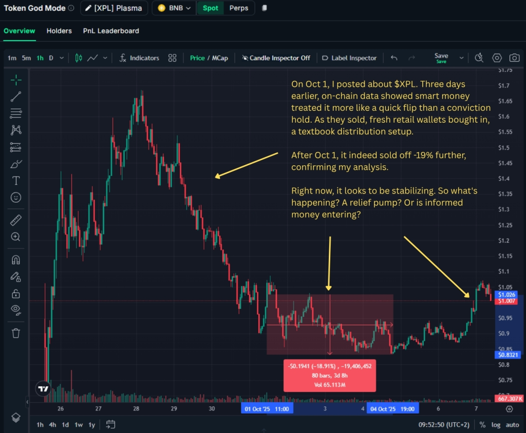 利好消息接踵而至:CEO否认团队抛售传闻、宣布Chainlink集成、Aave新增XPL支持。散户投资者纷纷抄底,坚信已触底。但Cryptor指出,聪明资金并未在这次反弹中回归。