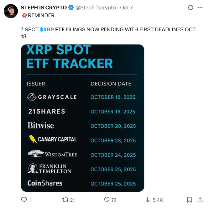 审查定于10月18日开始。若获批,这些ETF将为投资者提供受监管渠道便捷持有XRP的途径。XRP ETF追踪器 | 来源:STEPH IS CRYPTO