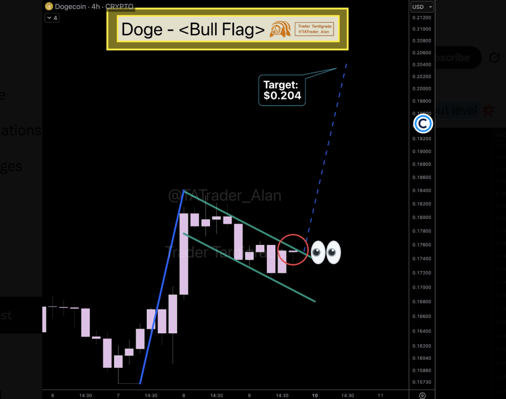 狗狗币逼近突破点,看涨旗形目标指向0.204美元