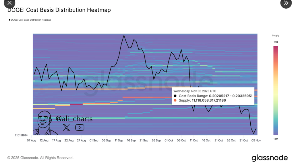 与此同时,分析师Ali Martinez援引Glassnode数据显示,约110亿枚DOGE在0.20美元价格区间完成吸筹。该区域既是关键阻力位,突破后可能转化为强力支撑。成本基础热力图中0.202至0.203美元呈现明显集群效应,意味大量持仓集中于此。成功突破或将使这些持有者转为长期投资者。