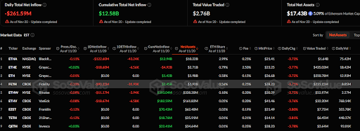 截至11月20日,以太坊ETF单日净流出达2.6159亿美元。其中ETHA与ETHE呈现资金外流,而ETH ETF保持稳定。FETH与ETHW虽出现价格波动但同样面临资金流出,其他以太坊ETF也呈现不同程度的价格震荡。