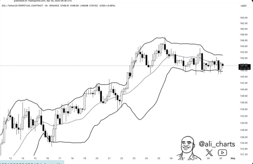 在4小时图上,Solana价格正处于布林带收缩形态中。值得注意的是,当价格波动急剧收缩时,就会出现这种技术形态,导致布林带在资产交易区间周围收紧。正如分析师Ali Martinez所指出的,这种模式表明SOL在144美元至150美元区间内震荡的盘整阶段。