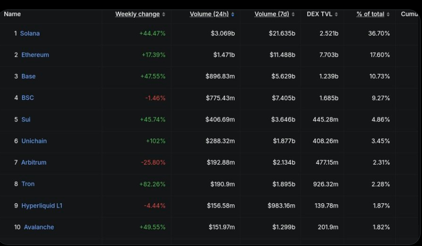 此外,24小时区块链活动追踪器显示,Solana在一天内完成了30.69亿美元的DEX交易。这一数字高于Base、BSC、Sui、Unichain、Arbitrum、Tron和Hyperliquid同期的总和。这也使Solana在每日DEX交易量方面位居所有区块链之首。