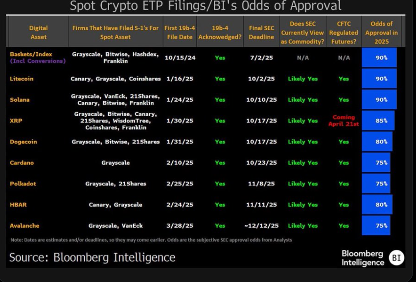此外,根据彭博情报,Solana和莱特币目前在现货加密货币ETF申请中领先,2025年获批概率为90%。这些强劲的几率,加上主要资产管理公司的申请,增强了对这两种资产的机构信心。