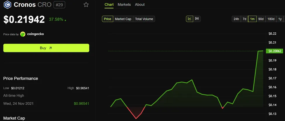 特朗普媒体分阶段收购策略与Cronos长期发展蓝图的叠加,为这个曾被质疑停滞的代币注入了新活力。截至发稿,CRO报价0.2194美元,24小时涨幅近40%。