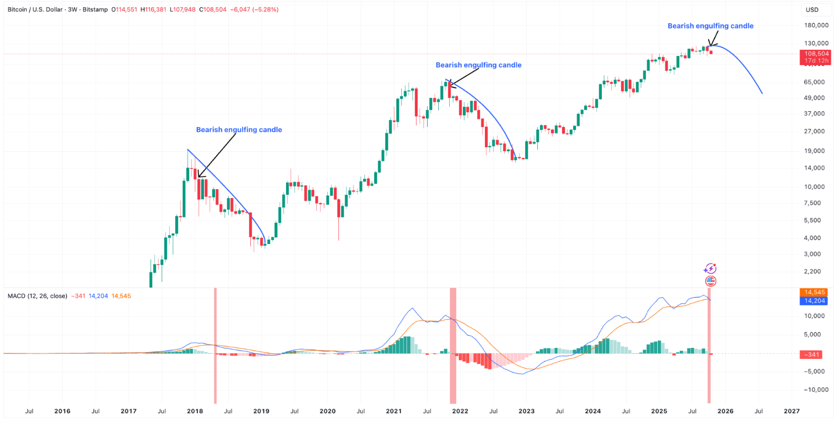 10月6日比特币创下历史新高后迅速遭遇滑铁卢,目前较峰值回落20,000美元仍能找到买家。分析师Jesse Olson指出,多位观察者关注到的MACD死叉现象成为牛市终结的信号。三周线图上的这一技术形态对长期前景构成压制,暗示与2017、2021年的周期顶点相似,本轮峰值或已显现。