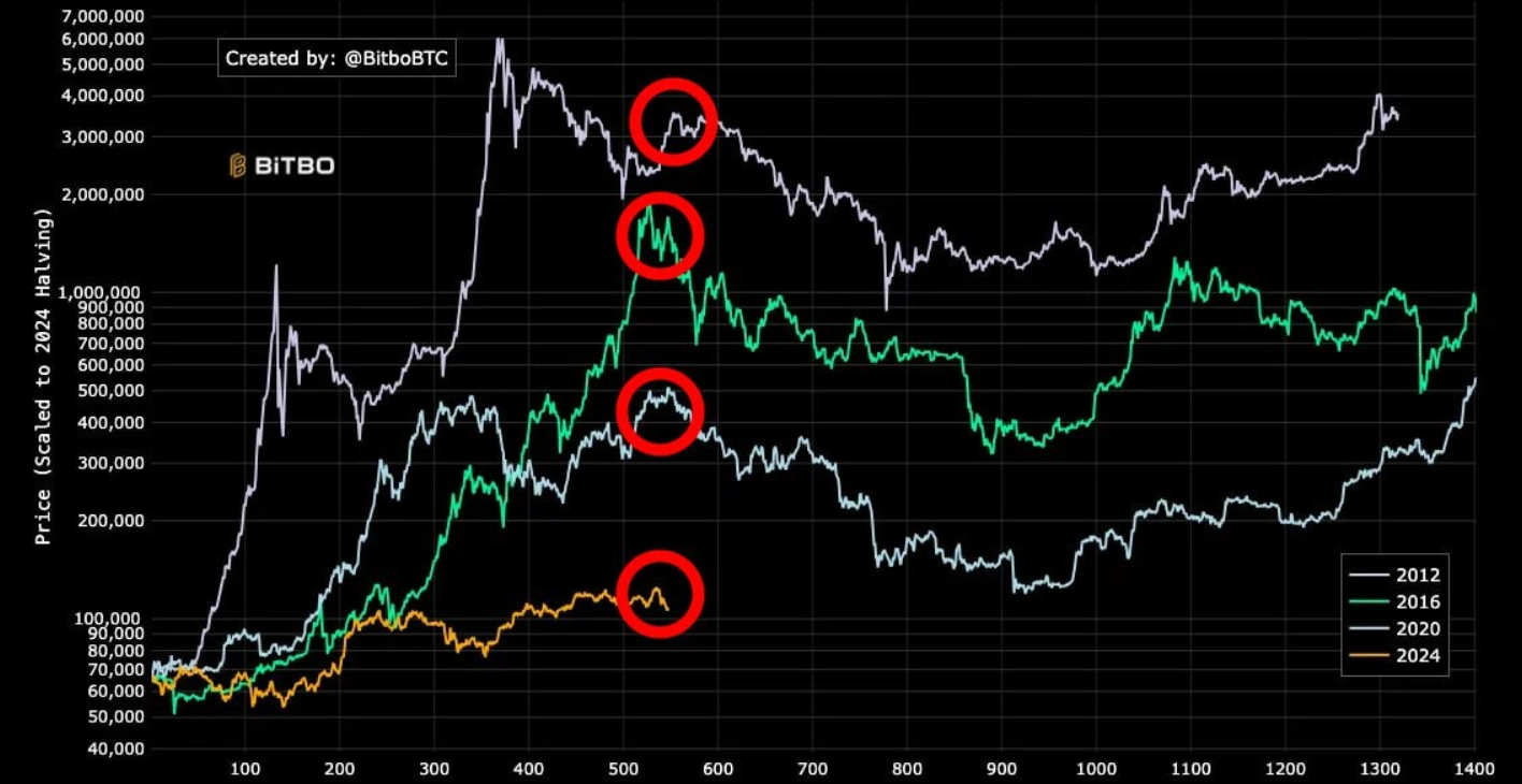另一关键观点来自Mister分析师,其研究聚焦于类似1064天周期的历史规律。观察2012与2016年减半周期可见,BTC在区块奖励减半后518-580天触及峰值。按此推算,当前比特币正处于减半后558天的敏感窗口,历史数据显示距离见顶最多尚有40天空间。