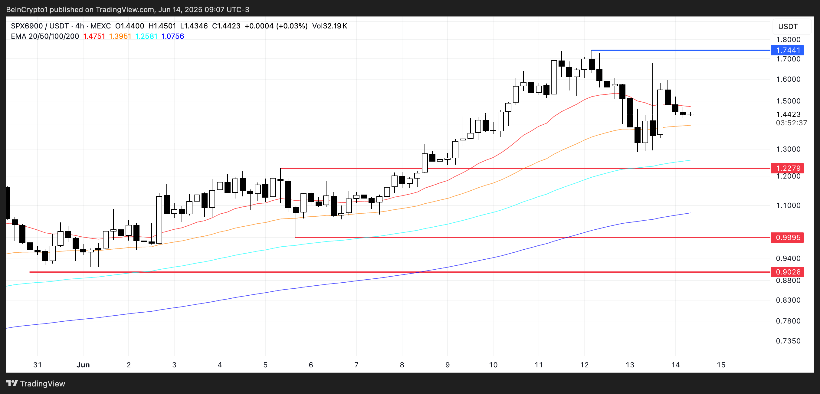 从技术面看,SPX的EMA均线仍呈多头排列,短期均线位于长期均线上方——尽管两者间距正在收窄。这表明上涨动能有所减弱,1.22美元支撑位成为关键观察区域。若该价位失守,价格可能进一步回调至0.99美元,甚至0.90美元。但如果看涨情绪延续且成交量放大,则可能突破1.74美元阻力位,开启新一轮上涨空间。