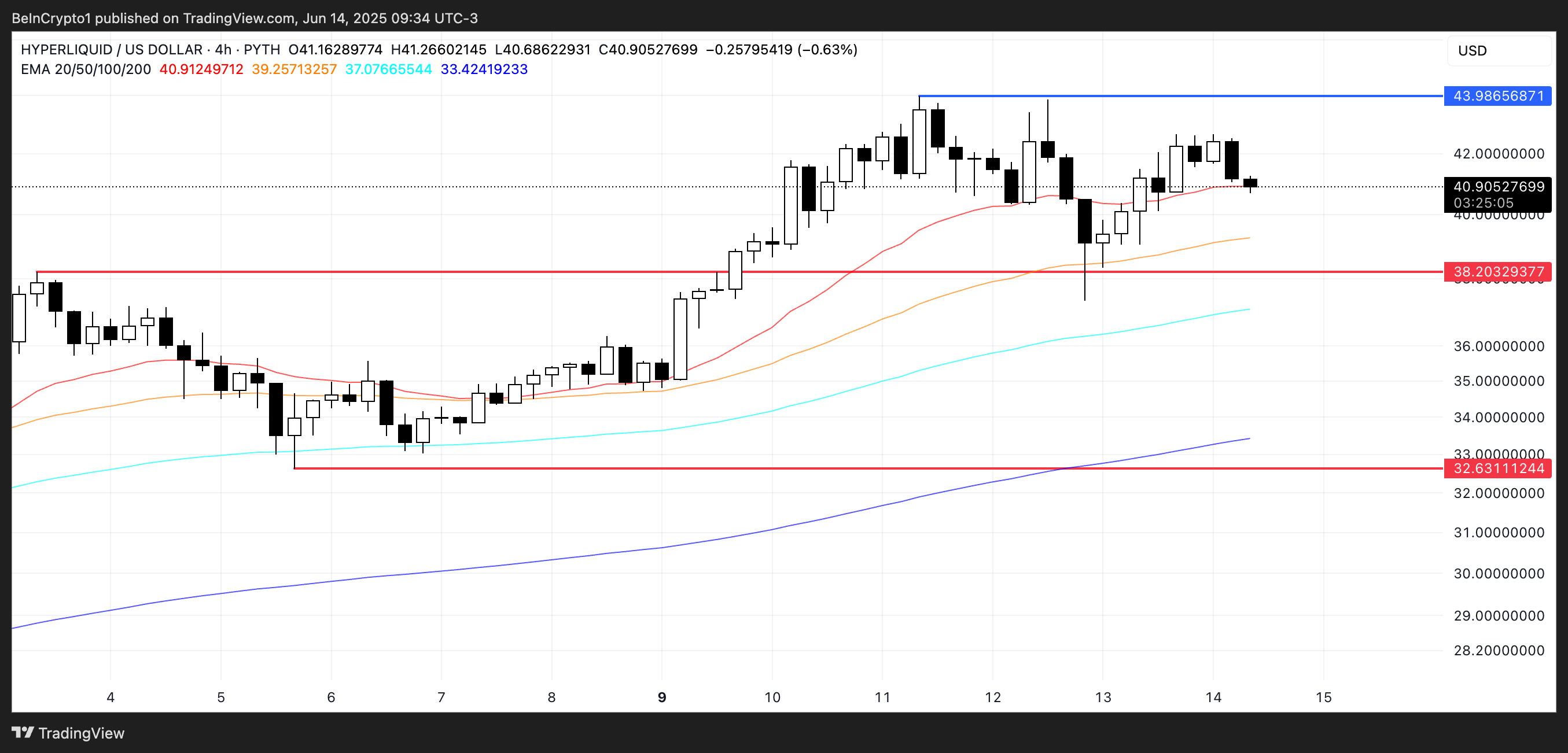 从技术角度分析,HYPE的强势得益于最近在Binance US上市以及可能登陆币安主站的传闻。若上涨势头延续,该代币可能很快突破45美元大关。但如果价格开始冷却且38.2美元支撑位失守,则可能回落至32.63美元。