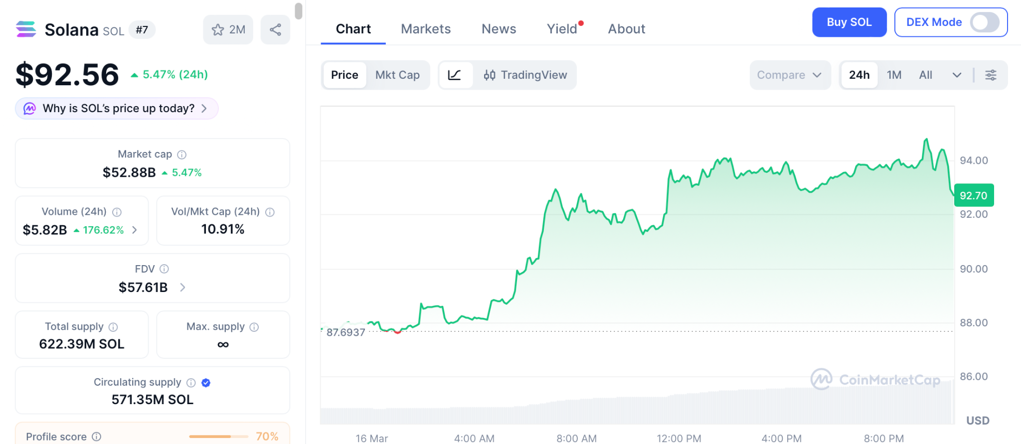 据CoinMarketCap数据显示,SOL交易价格接近92.56美元,正逼近95美元的阻力位。自2月13日以来,SOL现货ETF已连续五周录得资金净流入。衍生品市场显示其看涨仓位为一个多月来最高,3月13日的多空比率达到1.07。收盘价若站稳95美元上方,则将打开通往100美元的空间,120美元区域是更广阔的阻力位。