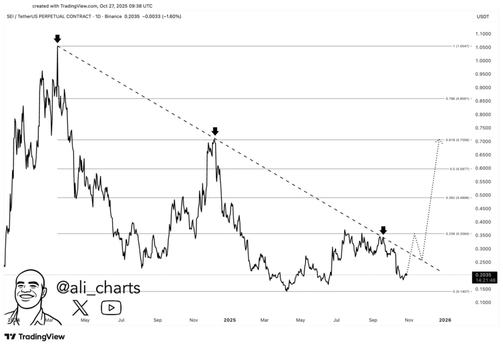 另一位分析师Crypto Patel同样持乐观态度。他发布的图表显示,SEI在多次尝试后终于突破下降趋势线。技术形态暗示,若动能持续,可能迎来近50%的涨幅,目标看向0.30美元附近。