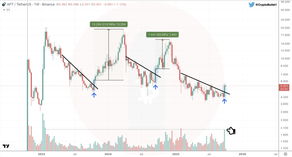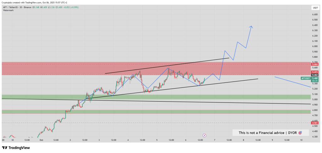 多数分析师注意到$APT正在形成上升通道形态。据CryptoJobs3分析,日线若能收于5.60美元上方,价格可能向6.40美元发起冲击,这或将引发市场情绪转向积极。