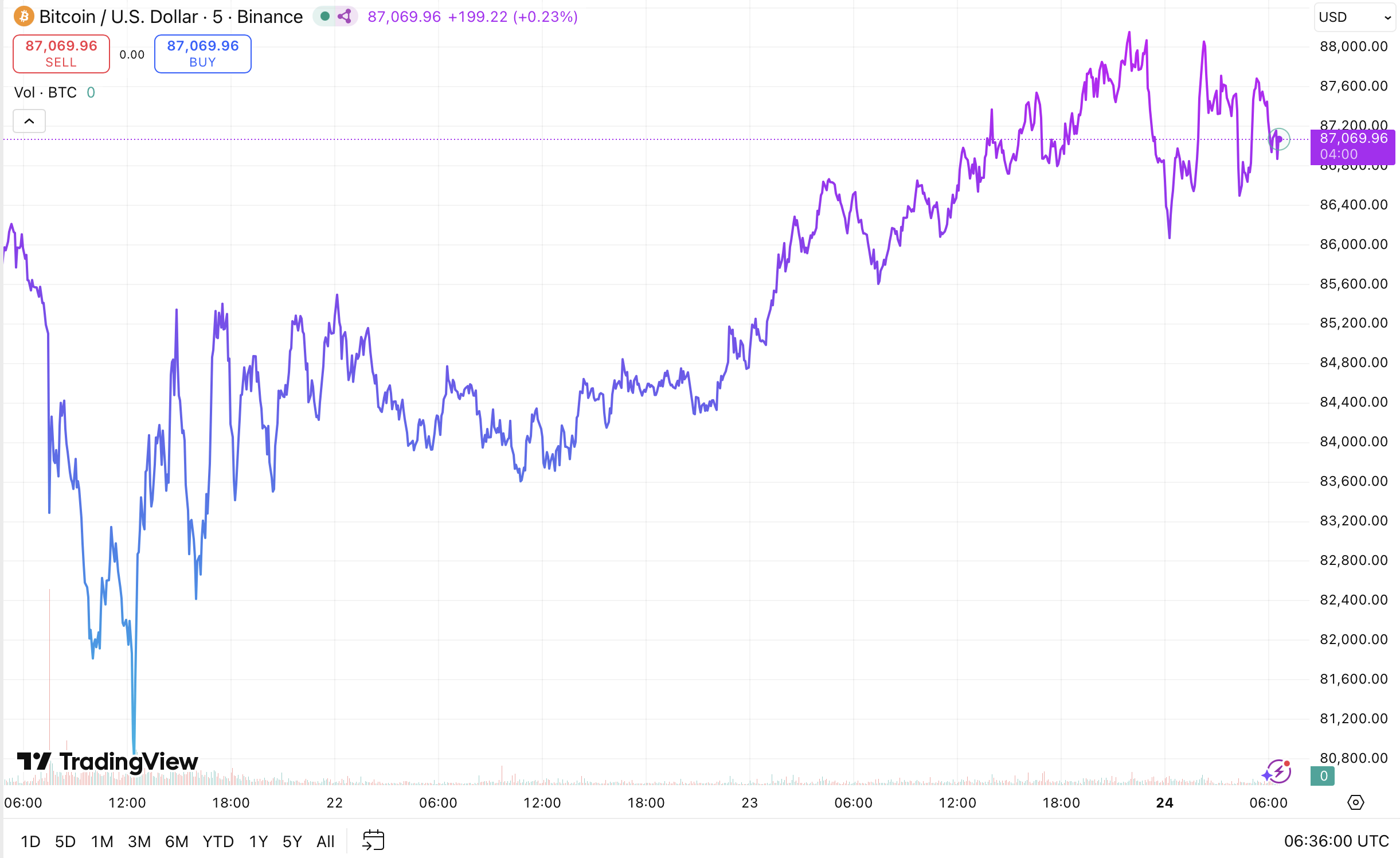 在整个11月23日至11月24日凌晨,比特币稳步攀升直至重回87000美元上方,完成了对前期破位的完全修复。