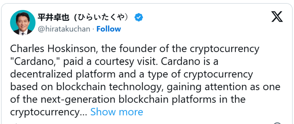 值得注意的是,日本IT部长平井卓也透露,Cardano创始人Charles Hoskinson最近对他进行了礼节性访问。部长在X帖子中宣布了这次会议,但没有明确讨论的细节。“我们进行了有意义的意见交流,”平井说。然而,他强调了Cardano在加密市场中日益增长的关注。据平井称,Cardano是支持智能合约和去中心化应用程序开发的下一代区块链平台之一。