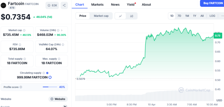 近日,备受关注的搞笑模因币FartCoin在24小时内实现了46.04%的惊人涨幅。截至发稿时,其交易价格已达到0.7354美元,市值飙升至7.3545亿美元。