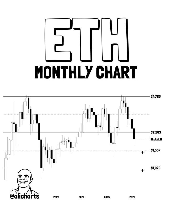 以太坊价格经历显著下跌后,正面临1557美元与1072美元的关键支撑考验。Ali Charts的分析指出,这两个价位是目前以太坊的关键支撑区域。未来价格走势将取决于这些支撑位的强度。