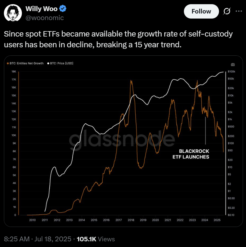 虽然ETF和自主保管服务于不同投资者群体,但分析师Willy Woo等人士警告,这可能削弱独立持有的吸引力。链上数据显示比特币自主保管量已从长期上升趋势中回落,暗示投资者偏好的转变。