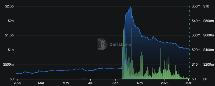 与此同时,去中心化金融生态系统的总锁仓价值在2026年3月3日达到10.3亿美元,此前在2025年末曾超过22亿美元的峰值。DeFi平台的日手续费为32.3万美元,而去中心化交易所交易总量为2056万美元。这些数据表明,尽管整体流动性有所下降,但交易活动仍在持续。