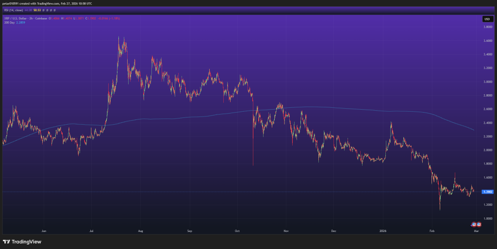 在2小时图表中,XRP交易于1.39-1.40美元区间,远低于位于2.20美元上方的200日移动平均线。自2025年末以来的整体趋势呈下降形态,高点与低点均逐步下移。RSI指标处于中性区间,未显示严重超卖,但也未呈现强劲看涨动能。