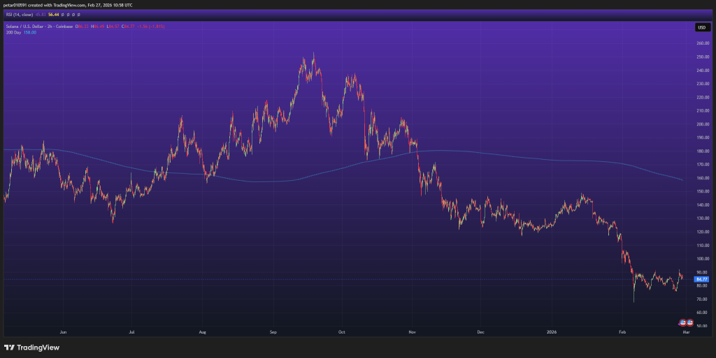 Solana当前交易价格约为85美元,较2025年末近250美元的高点经历长期回调。200日移动平均线远高于现价,位于150-160美元区域,显示下跌趋势之深。