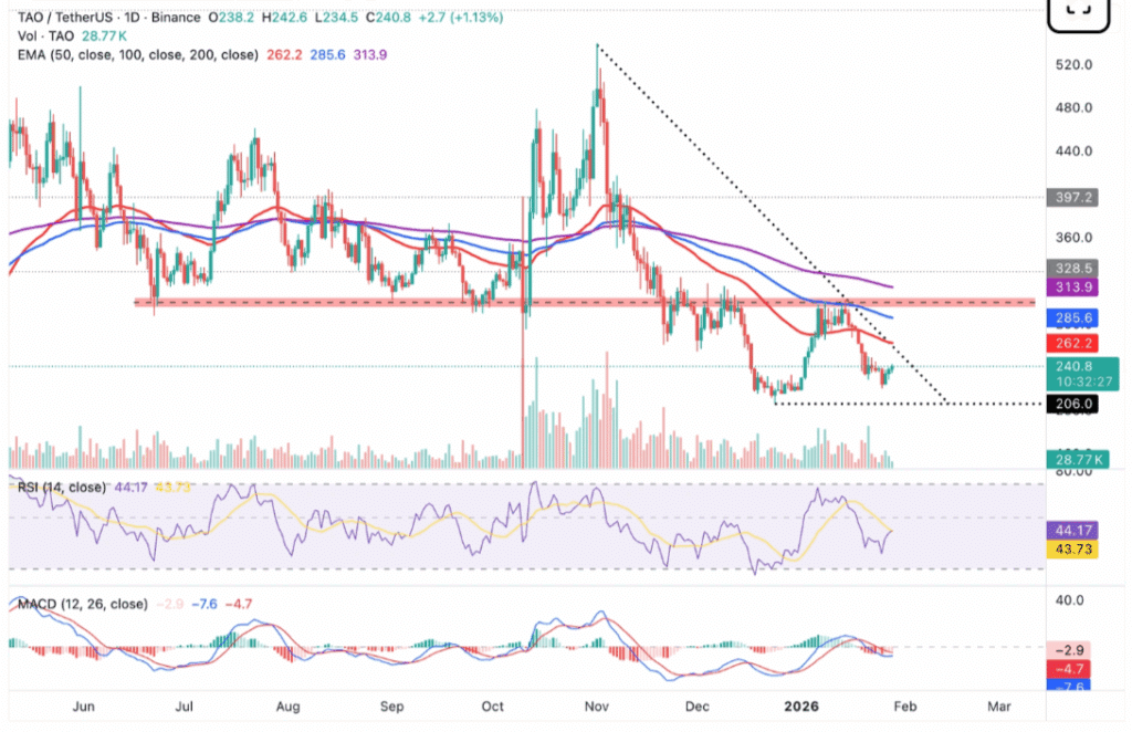 在市场整体上涨的背景下,Bittensor已连续三日保持上行态势,成功稳定在240美元关口上方。相对强弱指数(RSI)正攀升至43水平,预示着看跌压力正在减弱。若RSI突破中线,可能意味着TAO将开启看涨趋势。50日指数移动平均线(EMA)构成关键阻力位,将上行空间限制在262美元附近。若能突破该水平,则有望进一步上探100日EMA所在的285美元位置。
