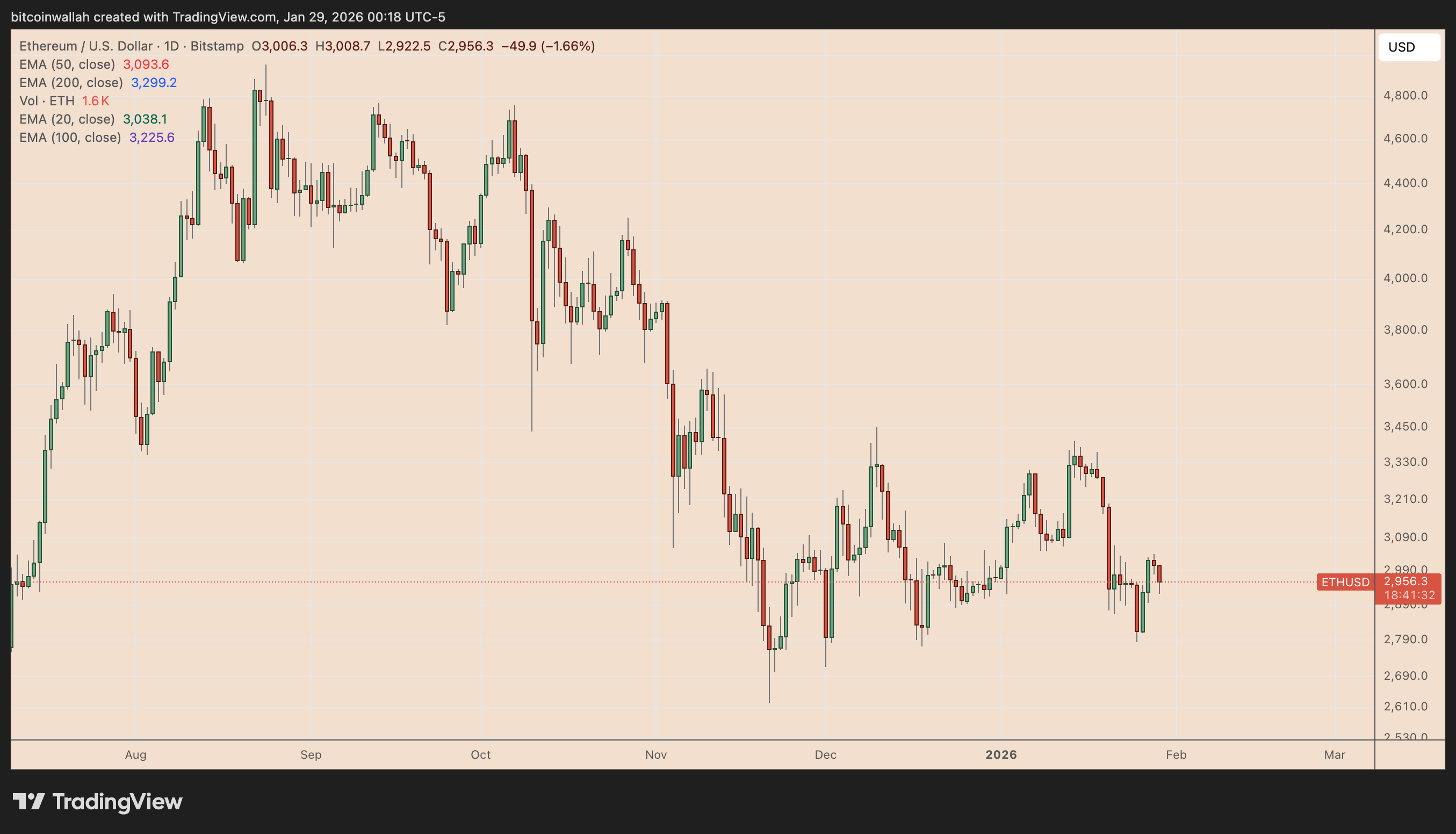 以太坊当前价格较近期3400美元附近的峰值已下跌逾14%,凸显卖方在3000美元上方的持续施压。看跌的技术形态表明,下行压力可能延续至二月。