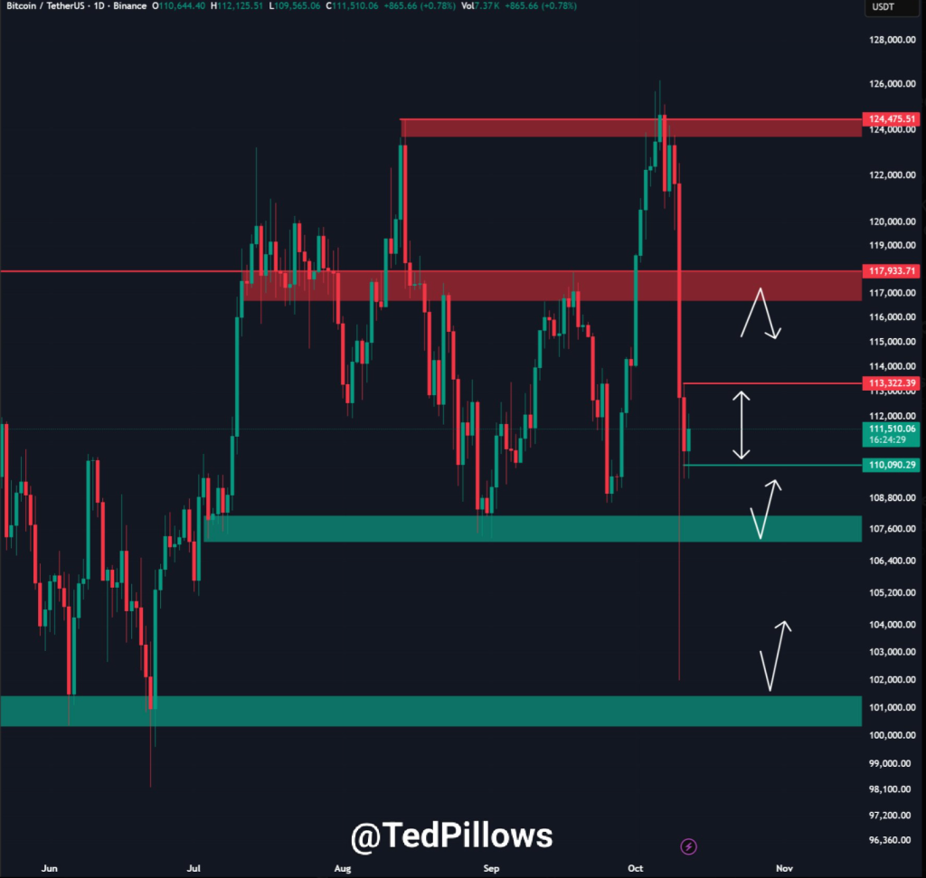 Ted指出比特币已重新站上11万美元支撑位,但市场结构仍不明朗。他强调11.35万美元构成阻力位,并警告若无法守住11万美元关口,可能引发价格向10.1万美元移动。
