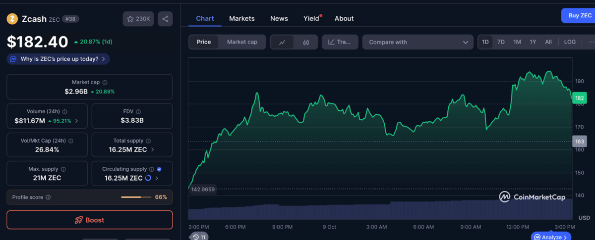 Zcash(ZEC)今日迎来强势上涨,伦敦交易时段收盘时涨幅达20%。尽管该代币过去一个月已飙升268%,但相较2016年10月创下的5941美元历史高点仍处于显著低位。截至发稿时,ZEC成交价报182美元,交易量激增95%至8.11亿美元。CoinMarketCap数据显示,其市值随之增长20%,目前达到29.6亿美元。