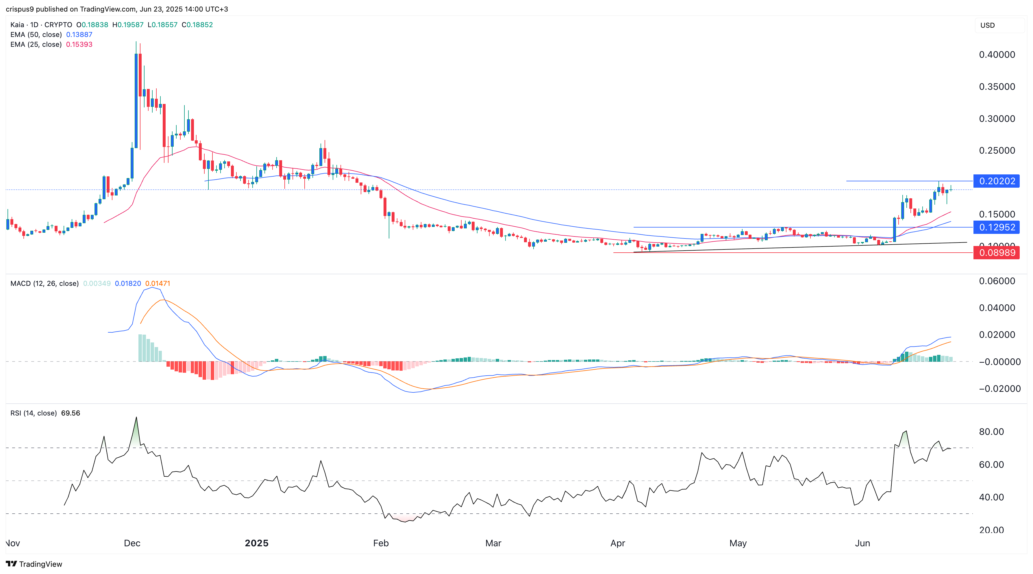 日线图显示,Kaia代币近几周强势反弹,从4月0.0900美元低点攀升至当前0.1883美元价位。价格已突破5月13日0.1295美元的关键阻力位,并站稳50日与25日指数移动平均线上方。相对强弱指数(RSI)和MACD指标持续走强。