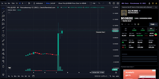 在币安Alpha平台宣布上线该代币交易后,涨势进一步加剧。交易启动初期,PALU市值从约300万美元飙升至8000万美元以上,并短暂触及1亿美元关口。官方推文显示,上线时该代币报价0.003美元,24小时跌幅达51.82%,但市场热情仍持续推高其价值。