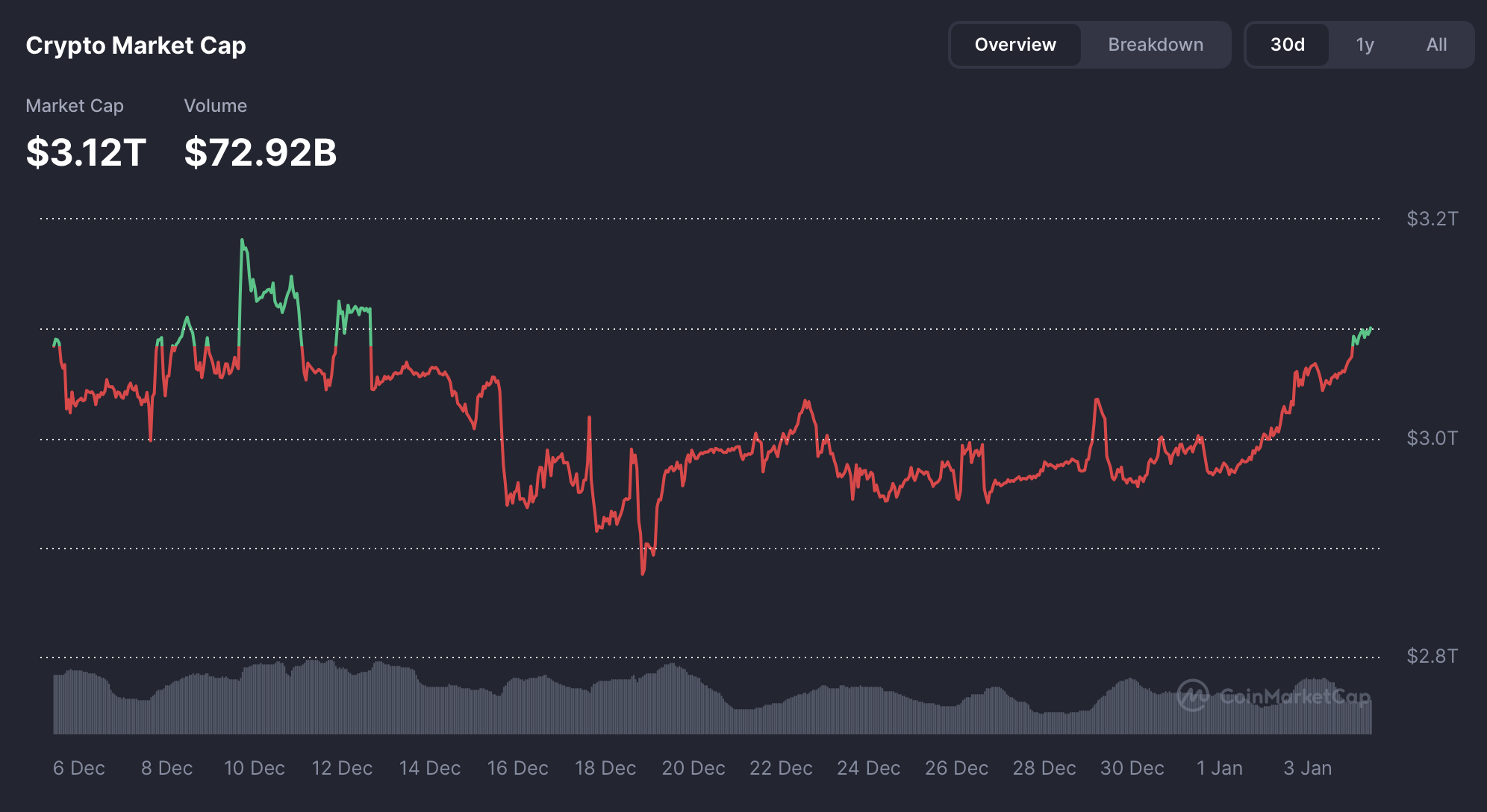 加密货币市场以强劲反弹开启了新的一年,总市值增长近2000亿美元,推动整体市值达到3.12万亿美元。根据最新市场数据,这一走势代表着年初至今近5%的涨幅,表明在经历了去年12月的波动后,市场风险偏好正在改善。