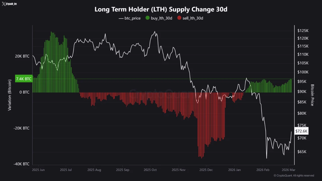 而在2月下旬至3月初,柱状图再次翻绿。最新数据显示,过去30天内长期持有者净积累约7,400枚比特币。该数值正位于图表上横向的绿色参考线,明确标志着这是自2025年7月以来首次出现可比拟的买入规模。