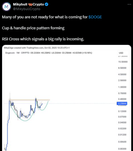 分析师MikybullCrypto表示,狗狗币月线图呈现可追溯至2021年峰值的杯柄形态。该形态作为延续模式通常出现在长期筑底后,"杯体"呈现圆弧状复苏,"柄部"则是突破前的短期整理。从技术面看,杯体从0.05-0.07美元基底延伸至0.36-0.40美元颈线区,今年形成的柄部震荡于0.15美元中段后反弹。交易者密切关注该颈线,因月线收盘突破前高往往开启量度目标。