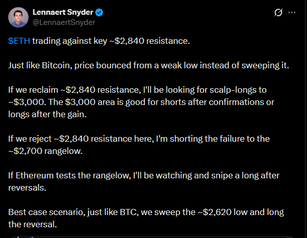 "如果我们能收复2,840美元阻力位,我将寻找 scalp-long 机会看向3,000美元,"他写道,这一判断在几小时后得到验证,价格收于该枢轴点上方。
